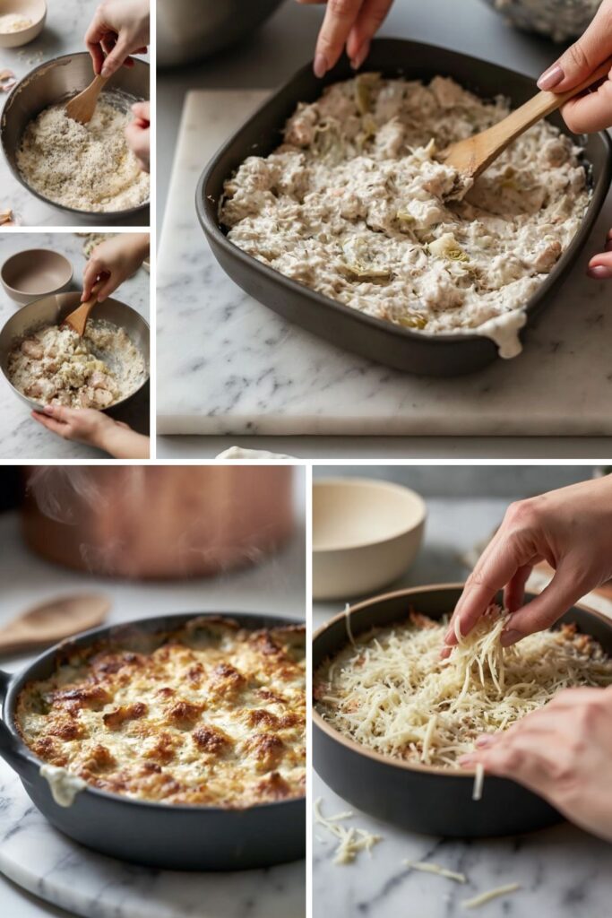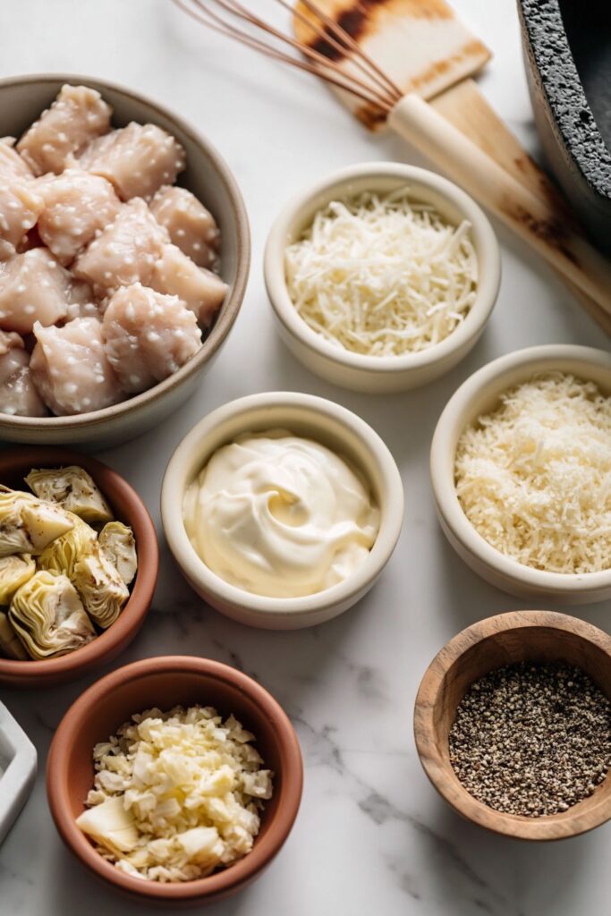 • 3. Combine Ingredients: Fold the chopped chicken pieces and artichoke hearts into the mayonnaise mixture until completely coated.