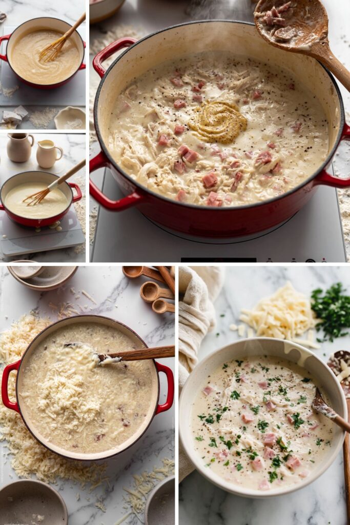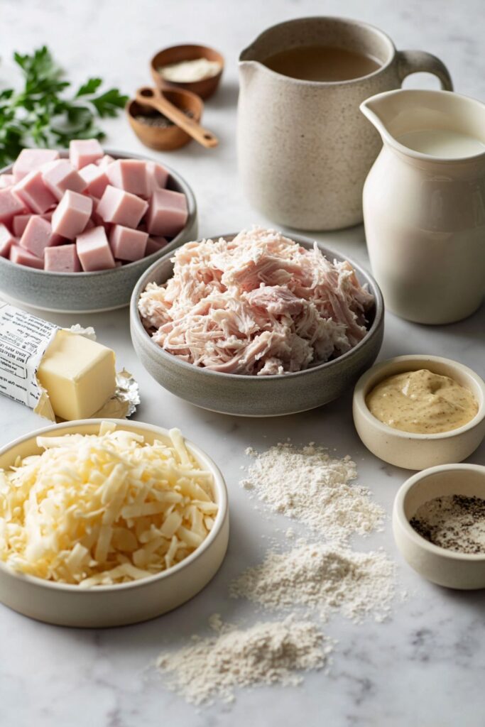 - 5. Add the Meat: Stir in the shredded chicken, diced ham, Dijon mustard, garlic powder, and black pepper.