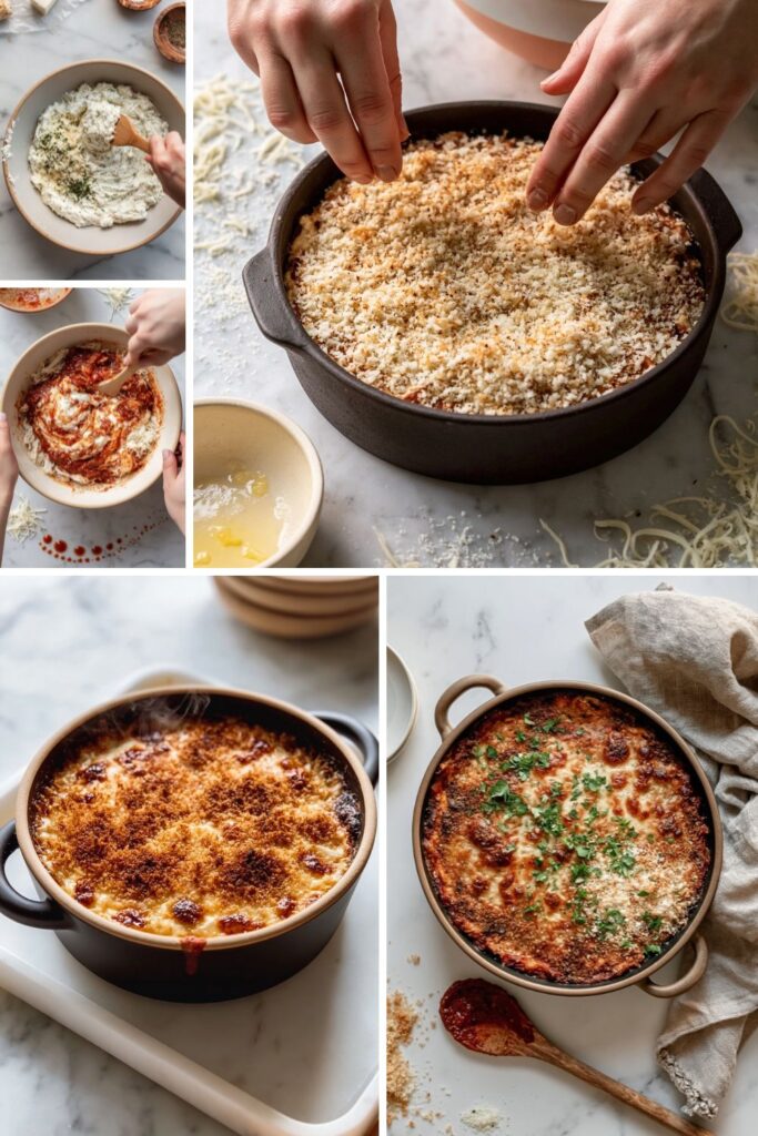 - Can I make this ahead of time? Yes, you can assemble the dip up to the breadcrumb topping a day in advance. Cover and refrigerate it, then add the fresh breadcrumbs right before baking.