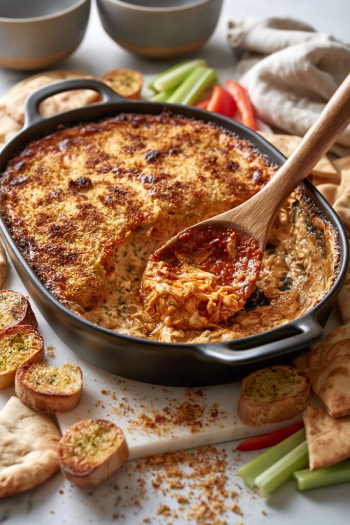 Sturdy dippers are essential for scooping up the thick cheese layer. Toasted crostini, thick pita chips, or robust garlic bread slices work beautifully. You can also offer celery sticks or bell pepper strips for a lighter crunch.