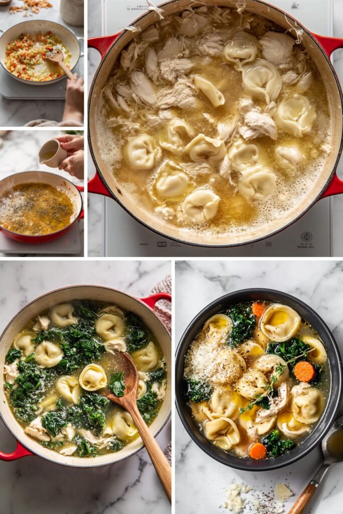 - 4. Cook the Tortellini: Add the shredded chicken and fresh tortellini to the pot. Simmer for 3 to 4 minutes, or according to the package directions, until the pasta is tender.