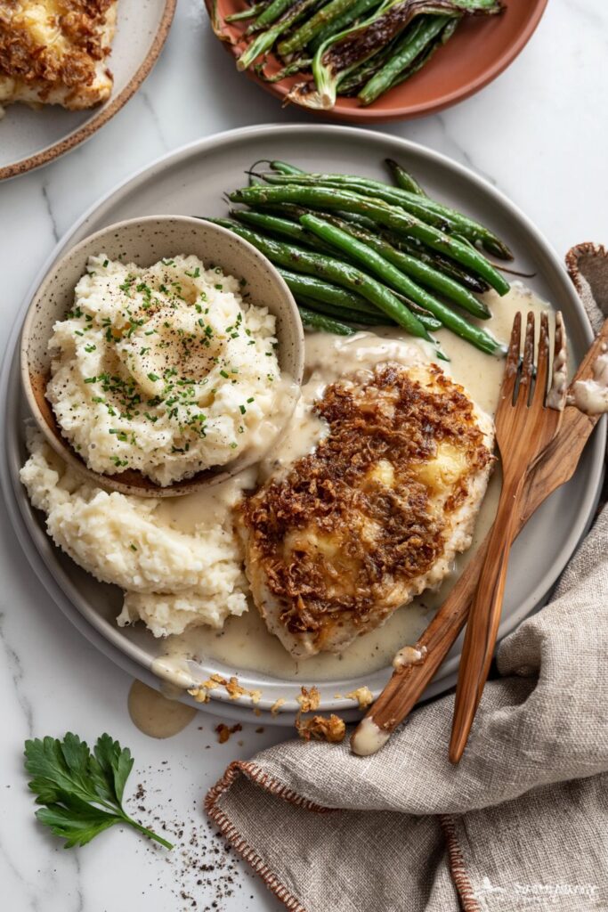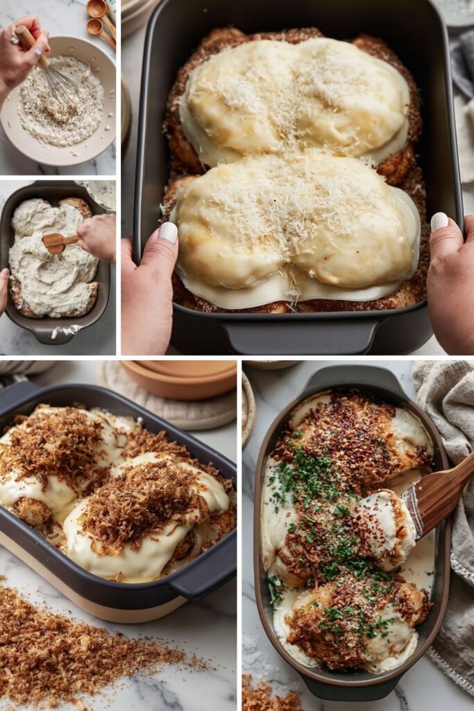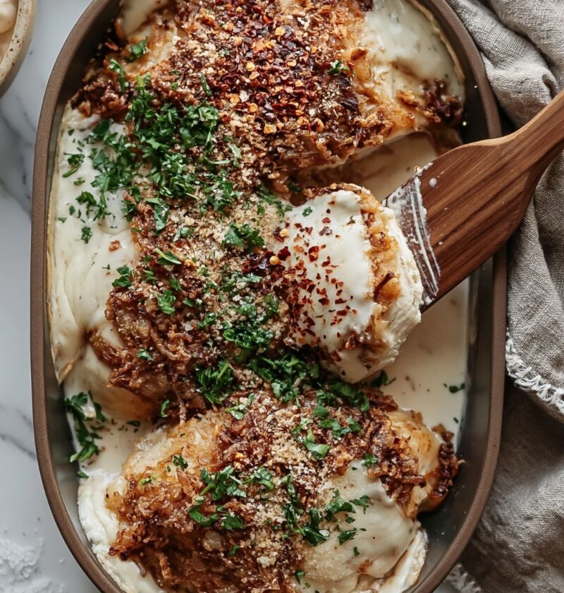 - Top and finish: Sprinkle the crispy fried onions on top and bake for another 5 minutes until golden brown and the chicken hits 165°F.