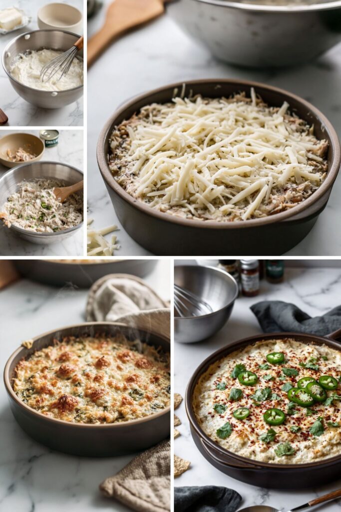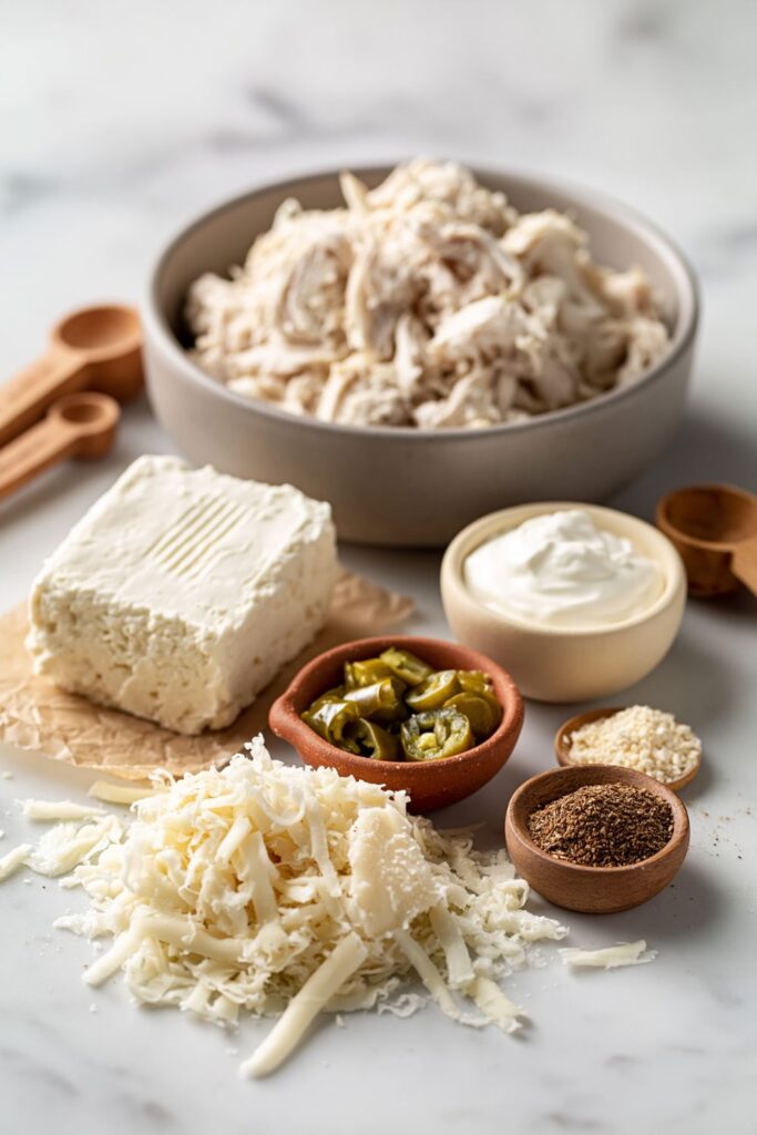 - 3. Add the mix-ins: Stir in the shredded chicken, drained green chilies, spices, and one cup of the Monterey Jack cheese.