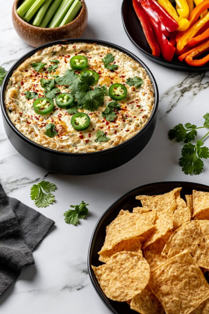 Sturdy tortilla chips are the best choice for scooping up this thick, hearty appetizer. For a lower-carb crunch, fresh celery sticks and sliced bell peppers work wonderfully.