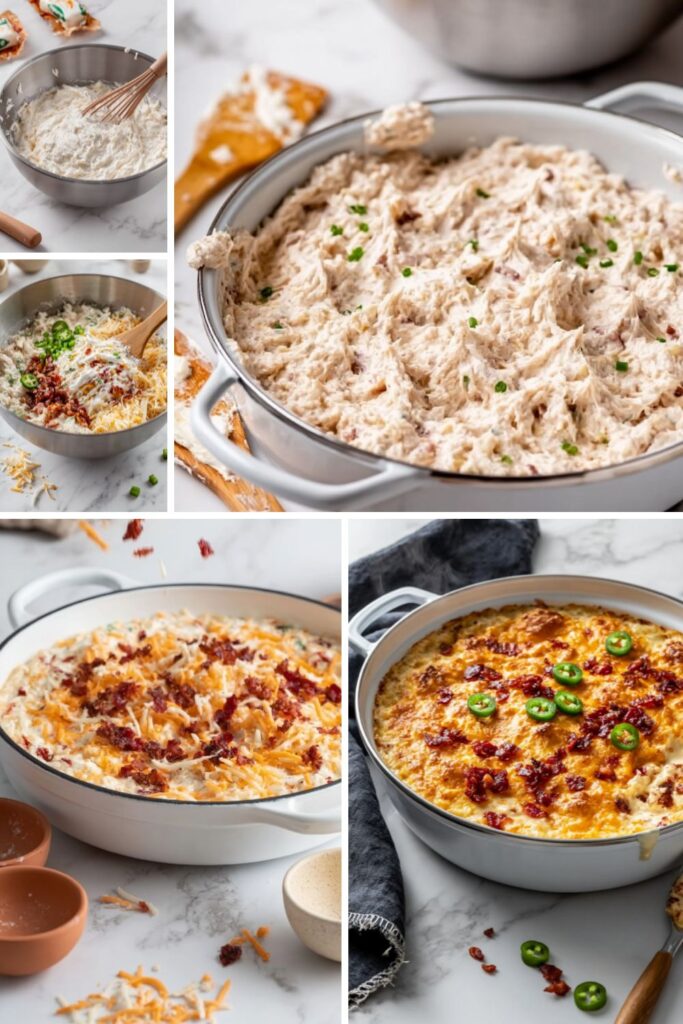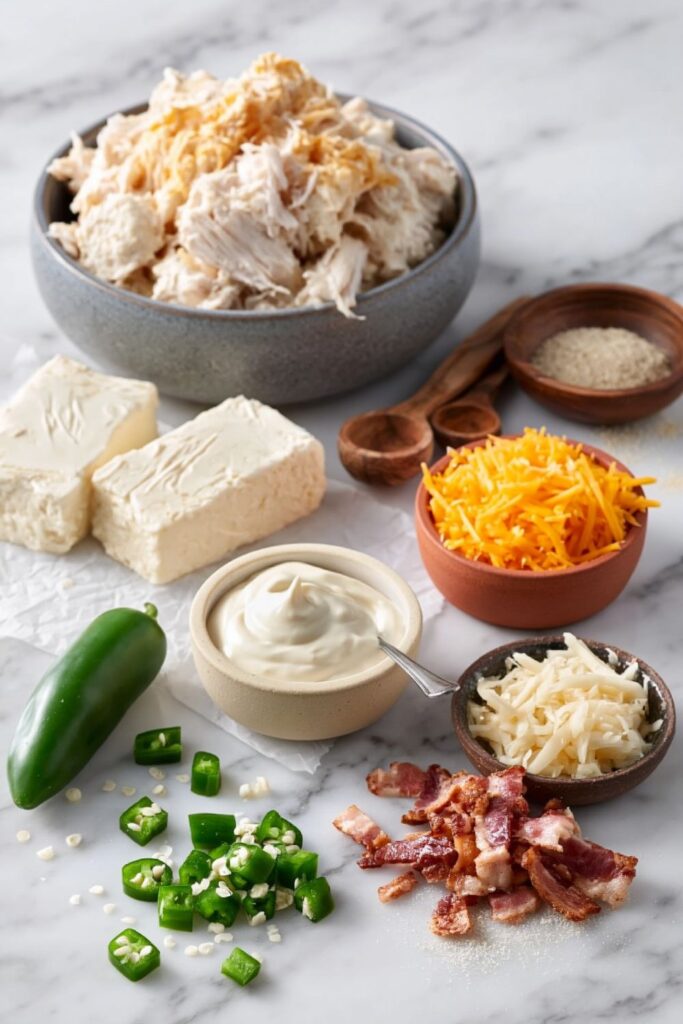 • Combine Ingredients: Fold in the shredded chicken, diced jalapeños, half of the bacon, and half of the cheddar and Monterey Jack cheeses.