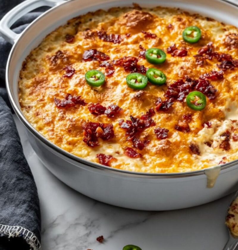 • Top and Bake: Sprinkle the remaining cheeses and bacon evenly over the top. Bake for 20 to 25 minutes until the edges are golden and bubbling.