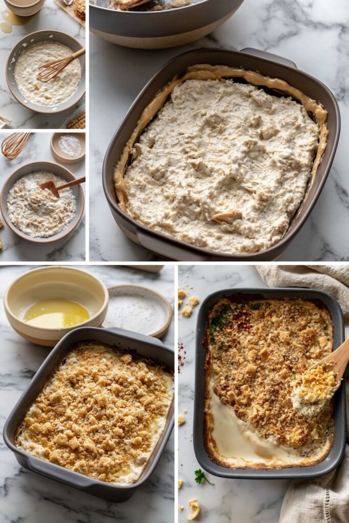 • 5. Add the Topping: In a small bowl, combine the crushed crackers with the melted butter. Sprinkle this crumb mixture evenly over the chicken base.